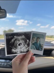 In a photo that quickly spread across social media, a hand holds two meaningful keepsakes: an early ultrasound image and a small instant photo of the smiling couple sitting together in their car. The ultrasound clearly shows the early gestational sac and fetal pole โ a tiny but powerful sign of new life beginning. Alongside it, the candid snapshot of Lydia and Zac radiates pure happiness, with both of them beaming as they enjoy the journey